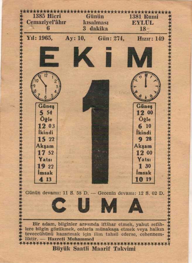 1 Ekim 1965 Takvim Yaprağı EFM(N)3510