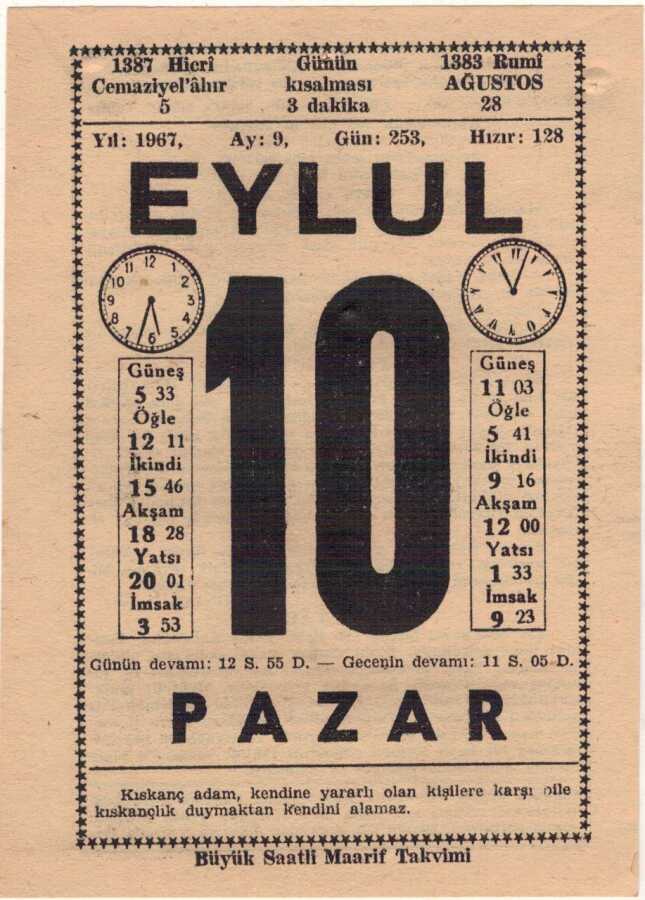 10 Eylül 1967 Takvim Yaprağı EFM(N)3608