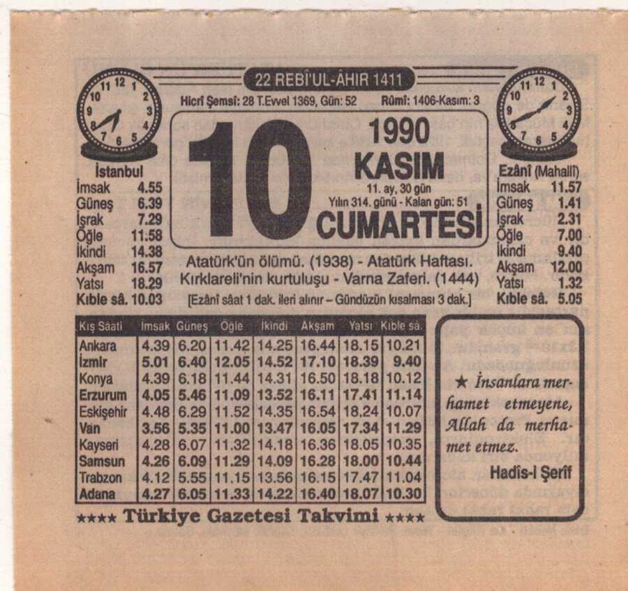 10 Kasım 1990 Takvim Yaprağı EFM(N)3924
