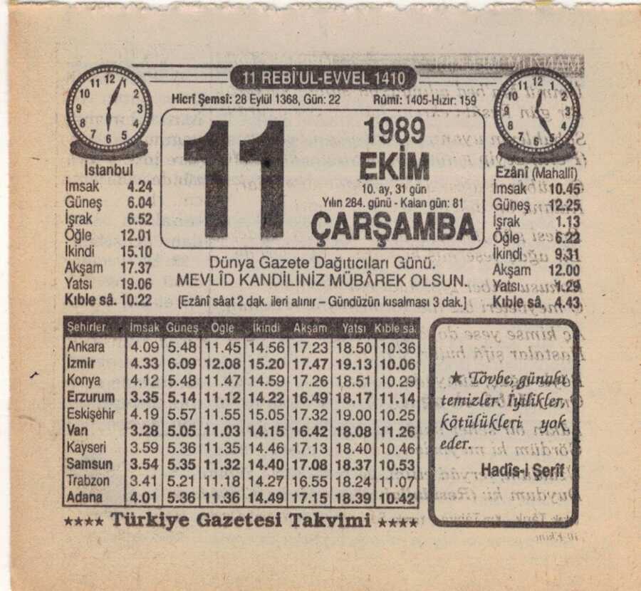 11 Ekim 1989 Takvim Yaprağı EFM(N)3105