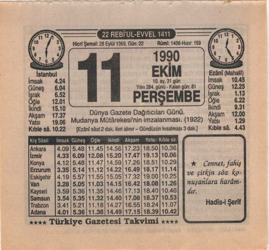 11 Ekim 1990 Takvim Yaprağı EFM(N)3136