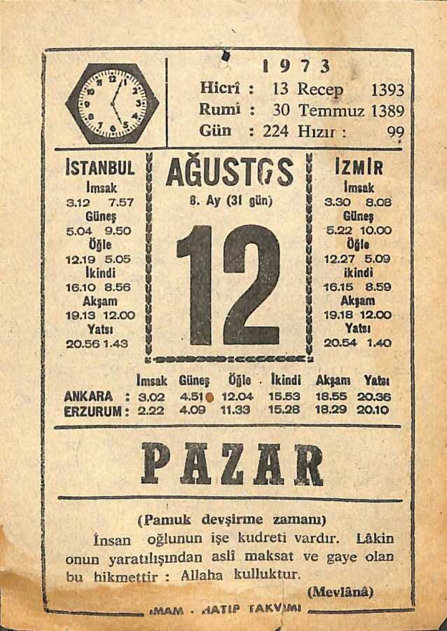 12 Ağustos 1973 Takvim Yaprağı - Doğum Günü Hediyesi EFM(N)10894