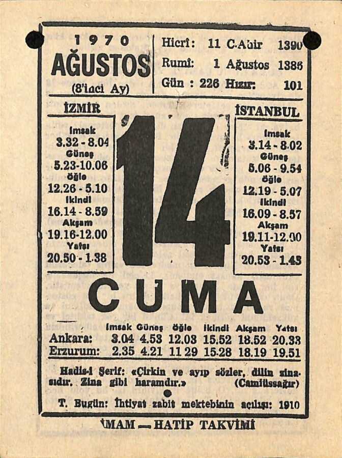 14 Ağustos 1970 Takvim Yaprağı - Doğum Günü Hediyesi EFM(N)9681