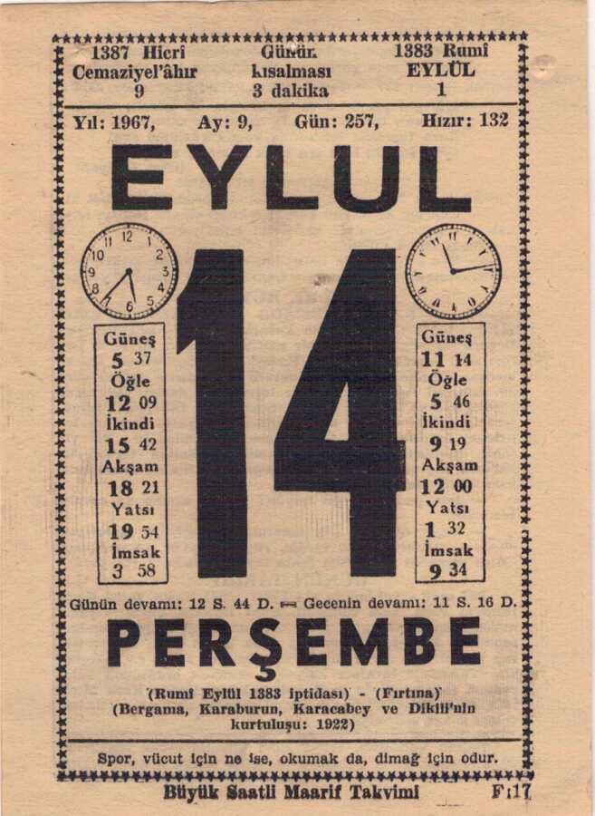 14 Eylül 1967 Takvim Yaprağı EFM(N)3619