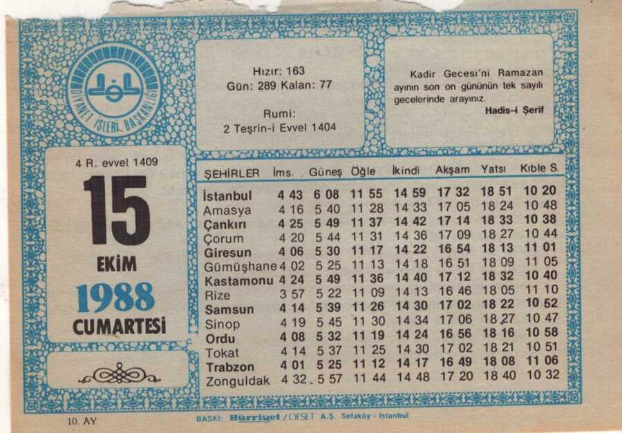15 Ekim 1988 Takvim Yaprağı EFM(N)3202