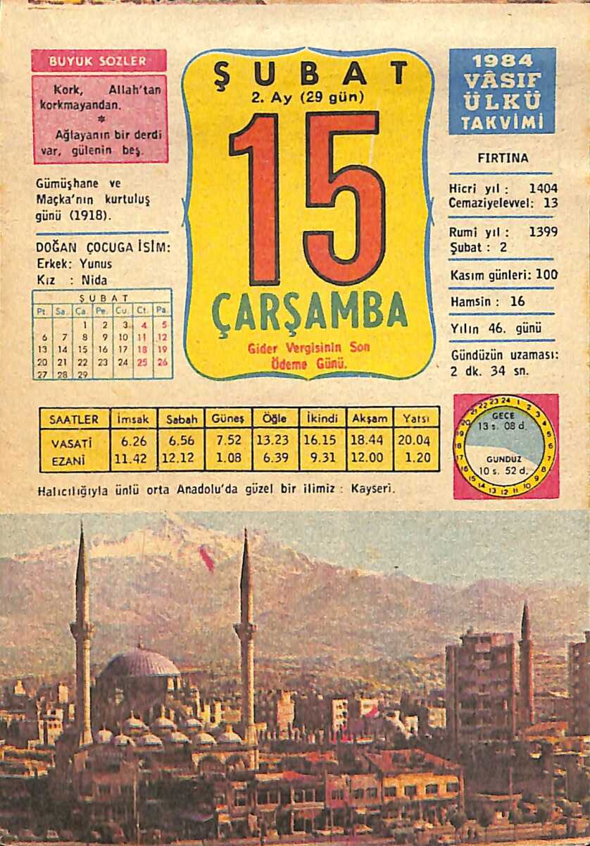 15 Şubat 1984 Takvim Yaprağı - Doğum Günü Hediyesi EFMN15227