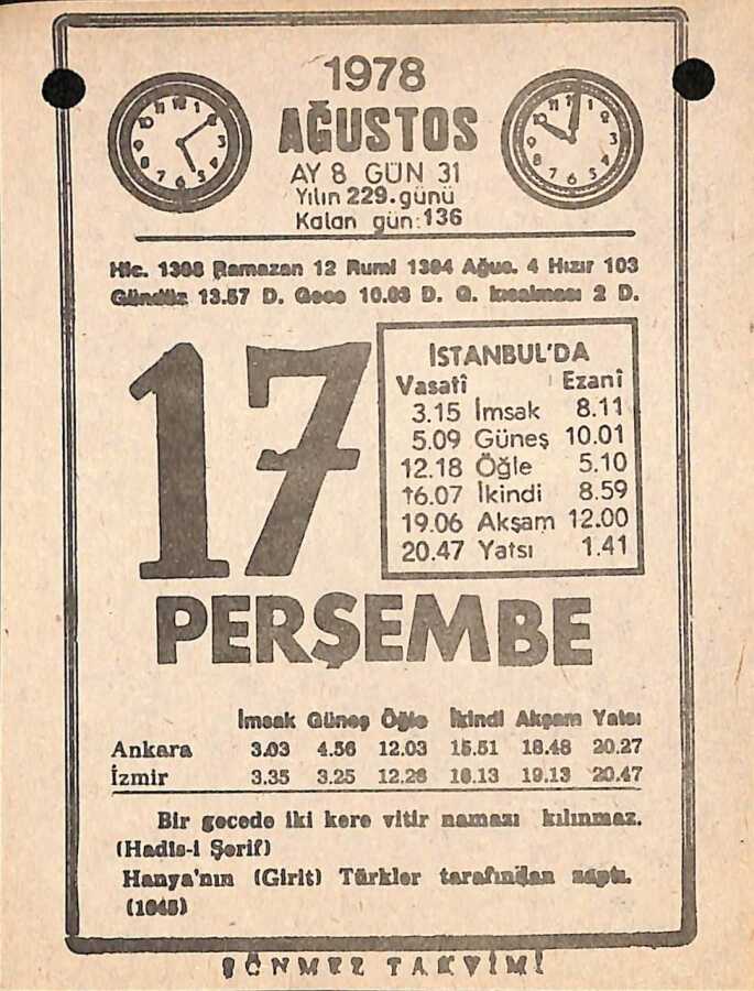 17 Ağustos 1978 Takvim Yaprağı - Doğum Günü Hediyesi EFM(N)9735