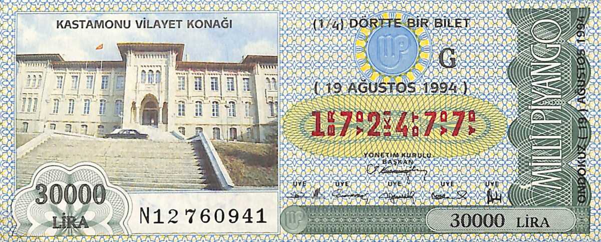 19 Ağustos 1994 Piyango Bileti Dörtte Bir Bilet PYB6599