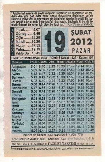 19 Şubat 2012 Takvim Yaprağı EFM(N)1860
