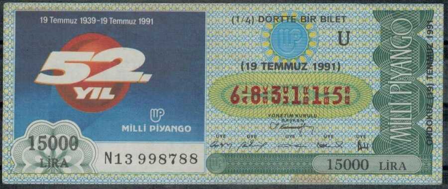 19 Temmuz 1991 Çeyrek Bilet PYB1014