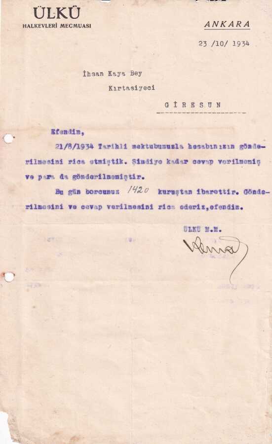 1934 Ülkü Halkevleri Mecmuasından İhsan Kayaya (Kırtasiyeci) İmzalı Yazışma EFM(N)8215