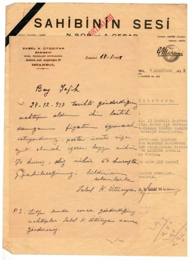 1938 Sahibinin Sesi -N.Şor ve A. Islak İmzalı Mektup EFM945