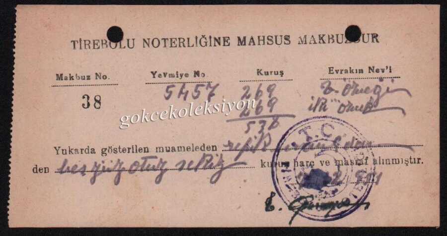 1951 Yılı T.C Tirebolu Noterliğine Mahsus Makbuzu EFM305