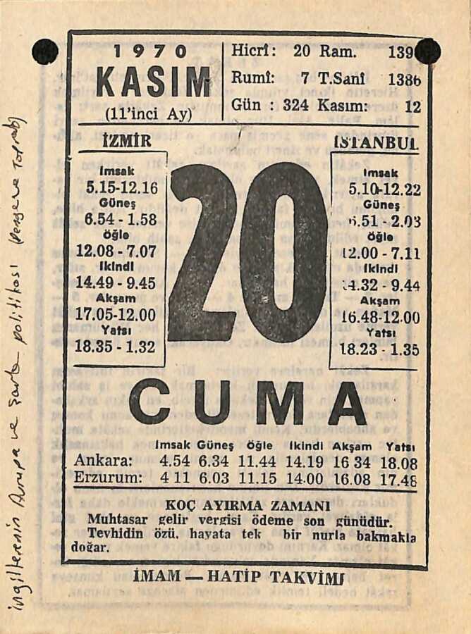 20 Kasım 1970 Takvim Yaprağı - Doğum Günü Hediyesi EFM(N)10752
