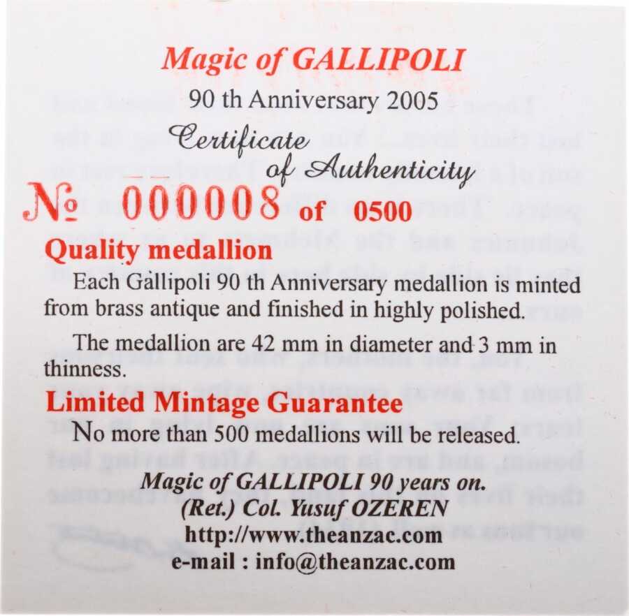 2005 Gelibolu 90.Yıldönümü Hatıra Madalyon *Anzak* (Özel Kutusunda- Sertifikalı) MVM941