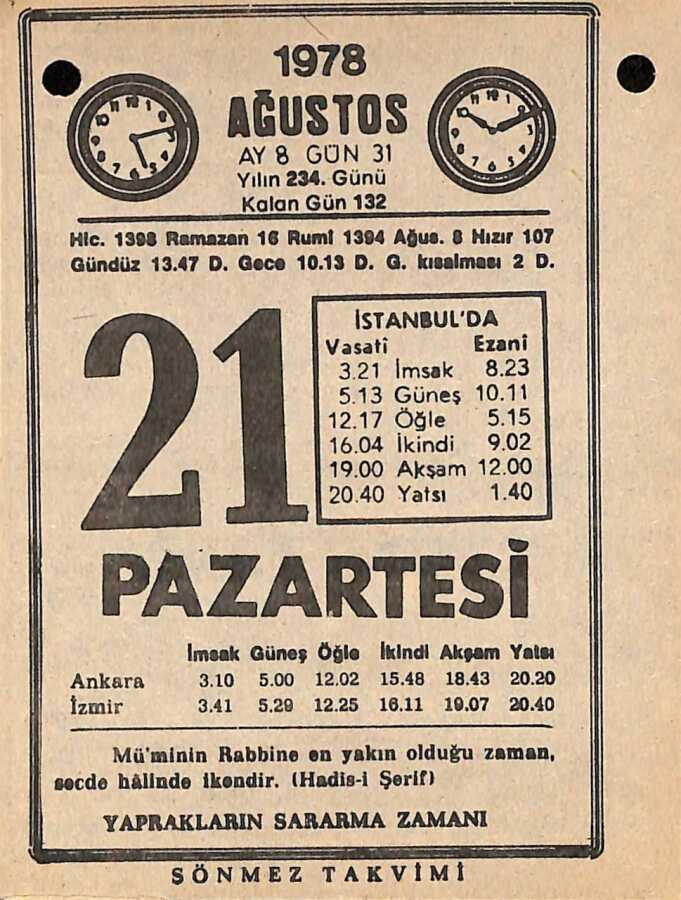 21 Ağustos 1978 Takvim Yaprağı - Doğum Günü Hediyesi EFM(N)9739