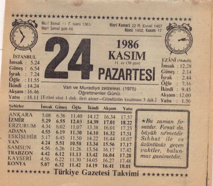 24 Kasım 1986 Takvim Yaprağı EFM(N)3424