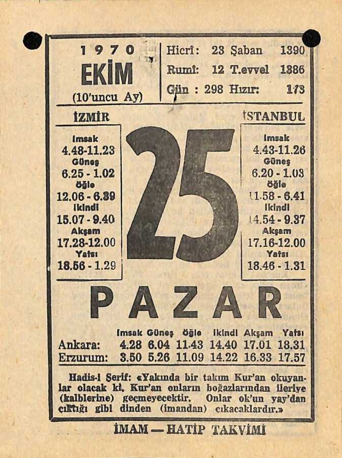 25 Ekim 1970 Takvim Yaprağı - Doğum Günü Hediyesi EFM(N)10555