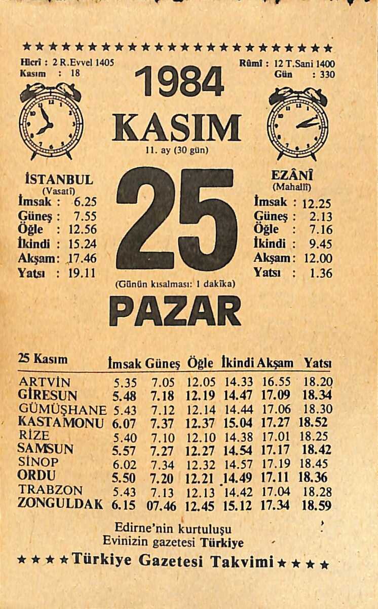 25 Kasım 1984 Takvim Yaprağı - Doğum Günü Hediyesi EFMN14529