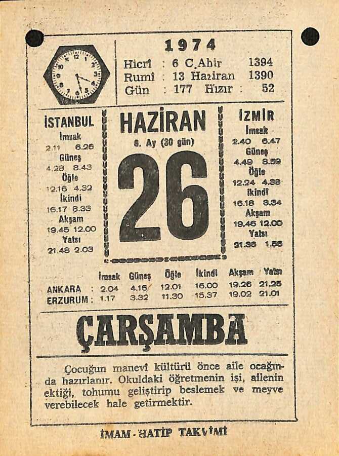 26 Haziran 1974 Takvim Yaprağı - Doğum Günü Hediyesi EFM(N)12135