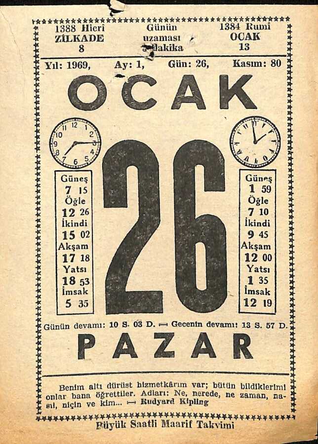 26 Ocak 1969 Takvim Yaprağı - Doğum Günü Hediyesi EFM(N)11023
