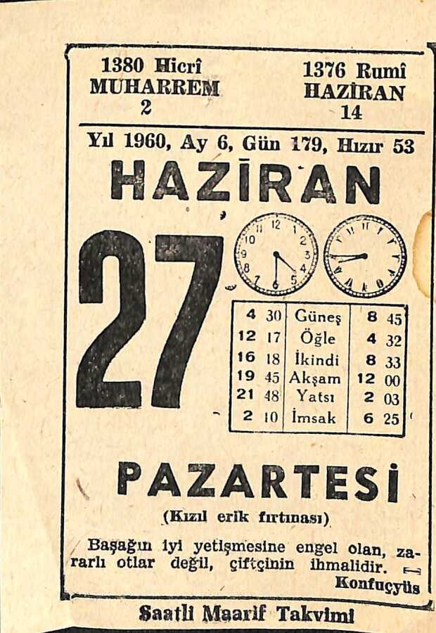 27 Haziran 1960 Takvim Yaprağı - Doğum Günü Hediyesi EFM(N)11263