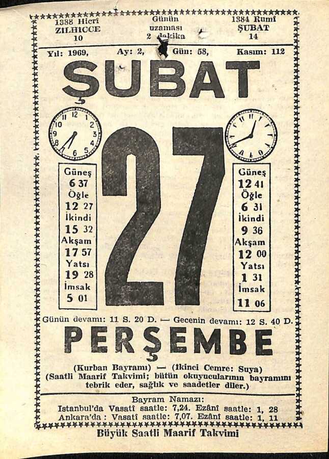 27 Şubat 1969 Takvim Yaprağı - Doğum Günü Hediyesi EFM(N)11010