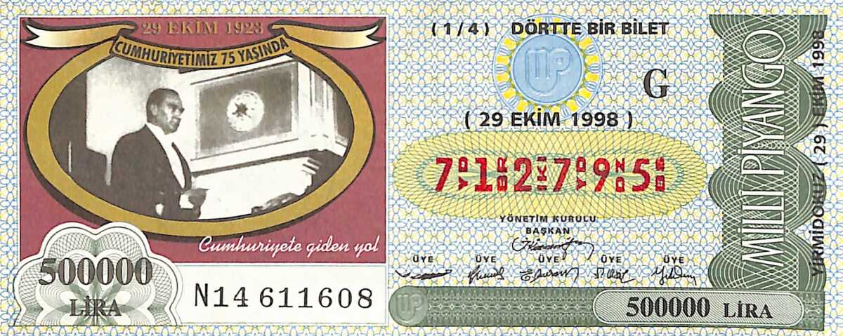 29 Ekim 1998 Piyango Bileti Dörtte Bir Bilet PYB6713