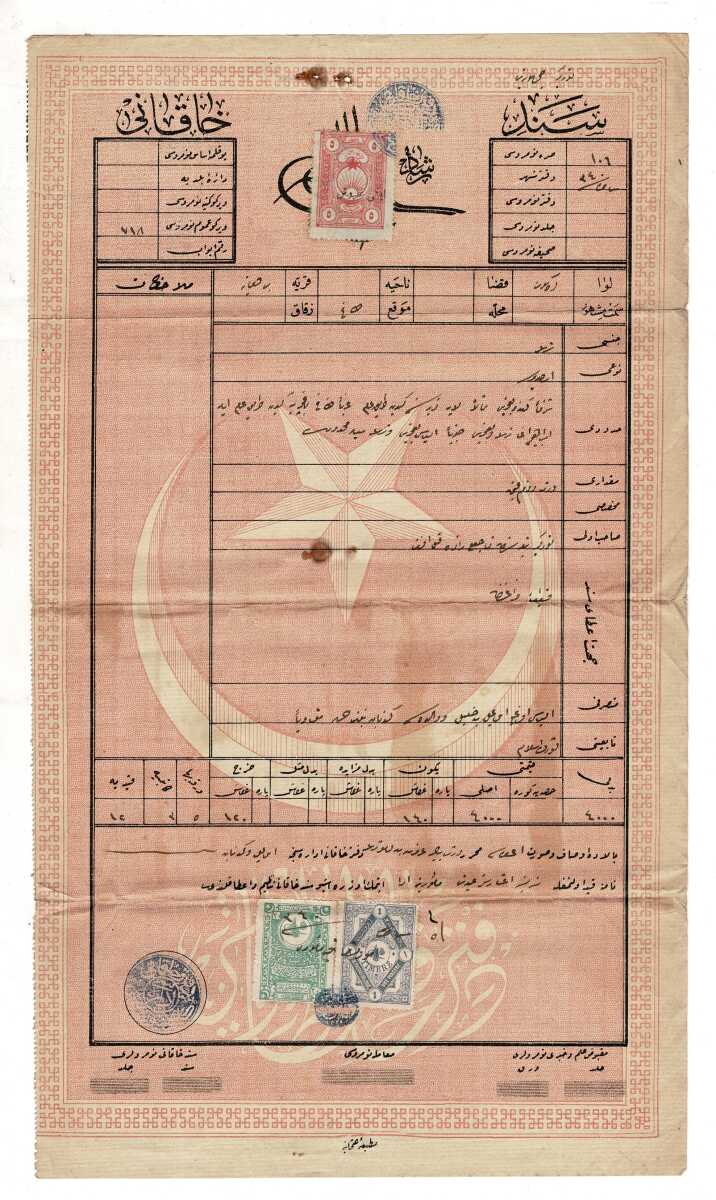 Osmanlı İmparatorluğu dönemine ait tapu senetleri ve resmi belgeler, tarihî ve koleksiyon değeri yüksek arşiv materyalleridir. Bu belgeler; arazi, tarla, ev, dükkân gibi taşınmazların mülkiyetini gösteren ve dönemin resmi kayıt sistemi içerisinde düzenlenen evraklardır.