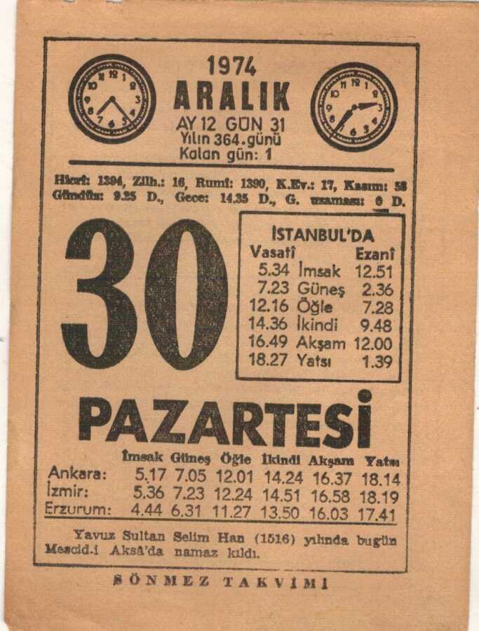 30 Aralık 1974 Takvim Yaprağı EFM(N)4312