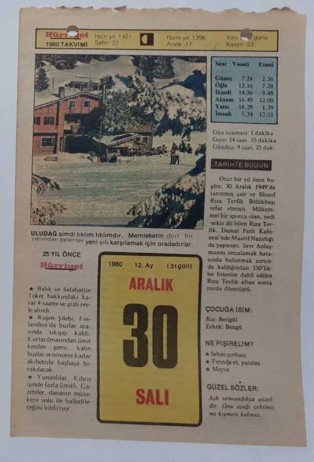 30 Aralık 1980 Takvim Yaprağı - Doğum Günü Hediyesi EFM(N)7246