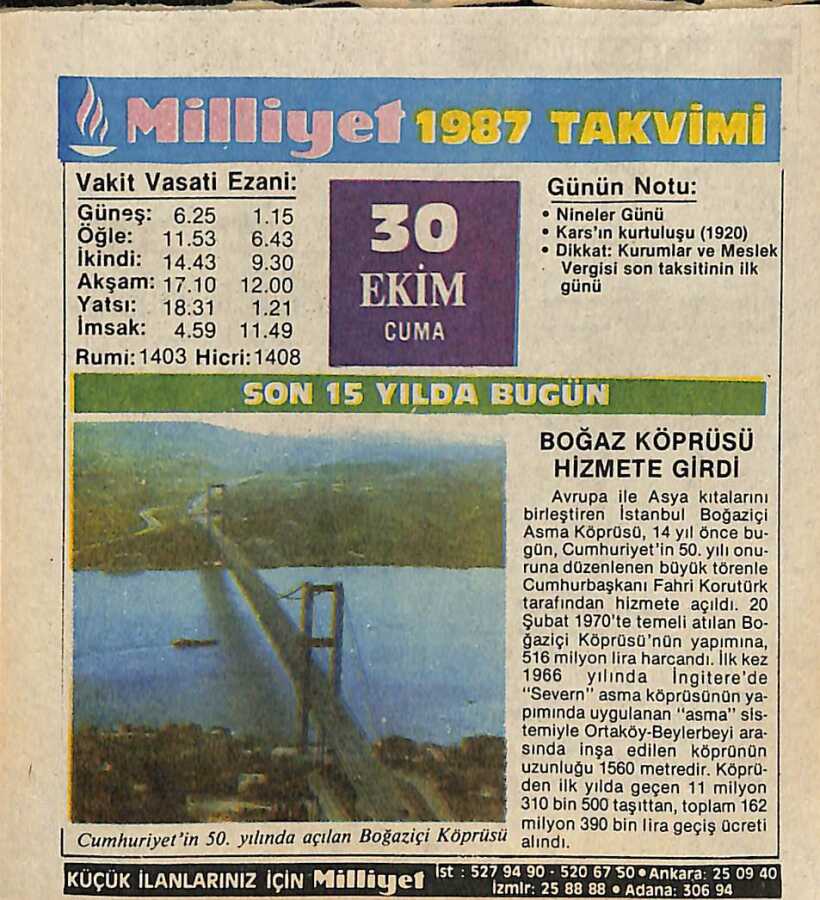 30 Ekim 1987 Resimli Takvim Yaprağı - Doğum Günü Hediyesi EFM(N)10528