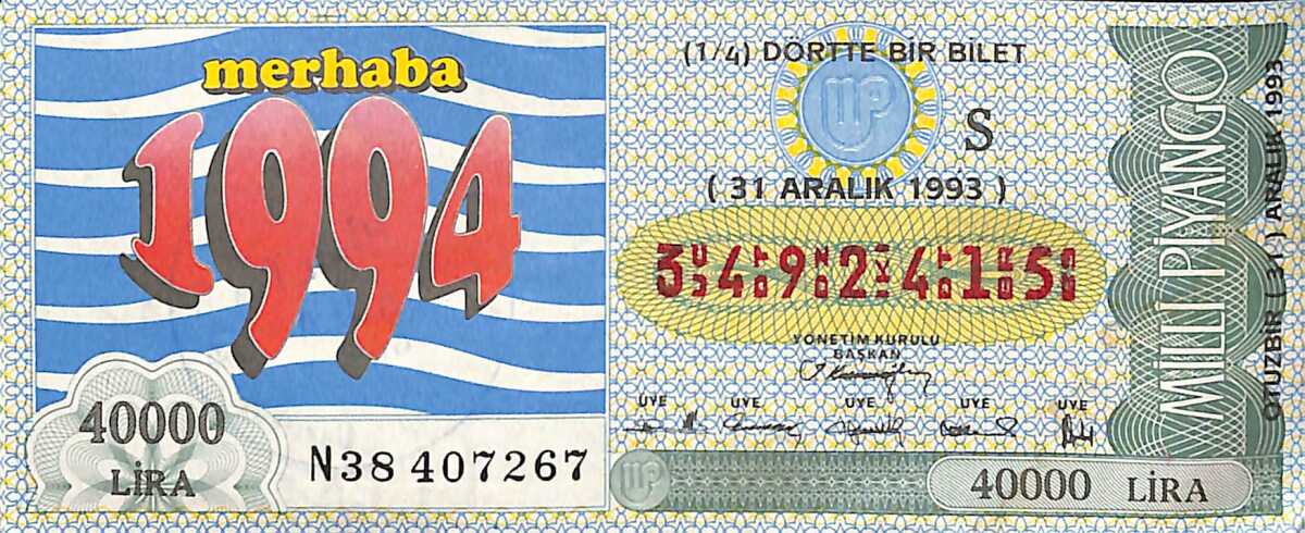 31 Aralık 1993 Piyango Bileti Dörtte Bir Bilet PYB6759