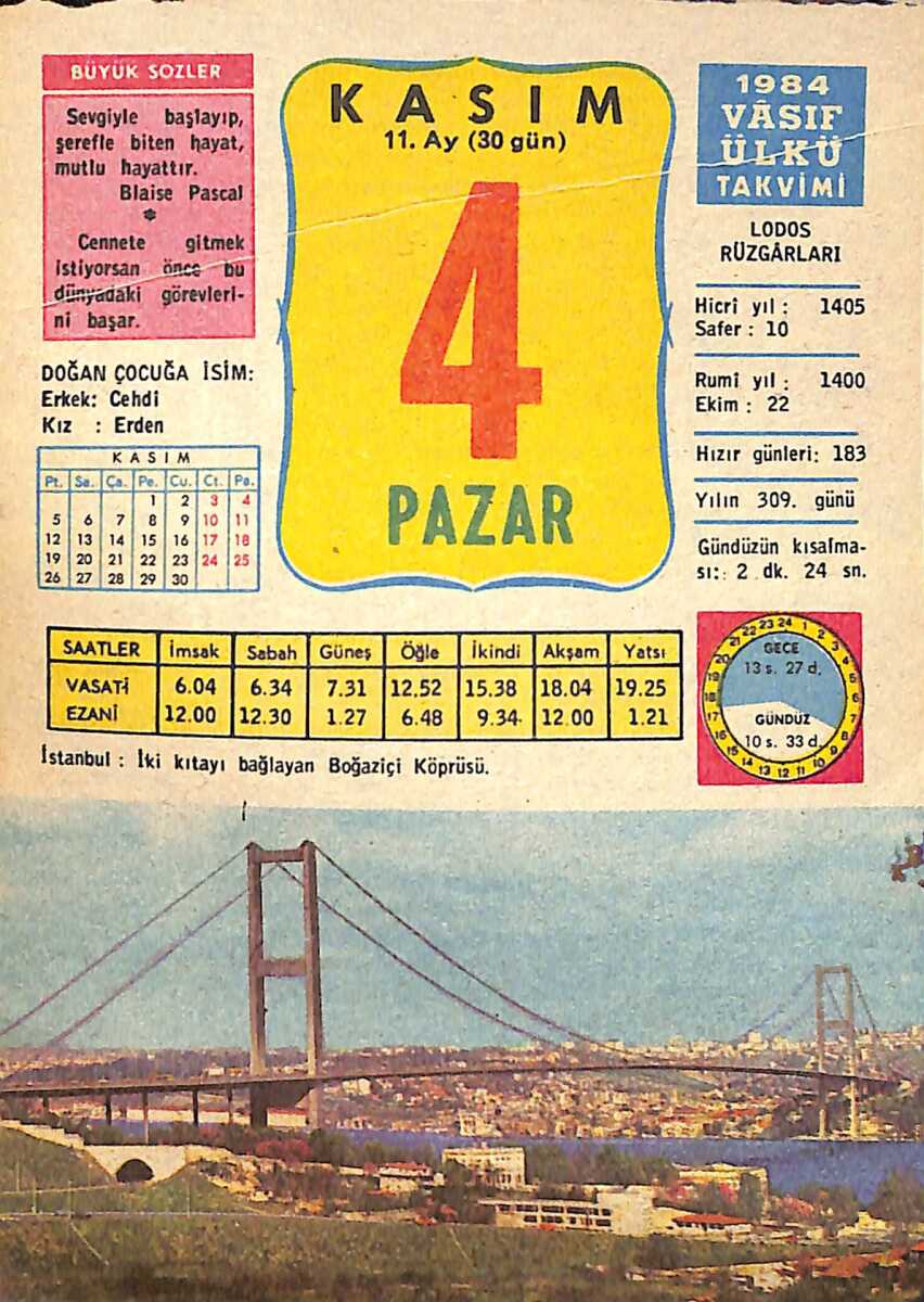 4 Kasım 1984 Takvim Yaprağı - Doğum Günü Hediyesi EFMN14806