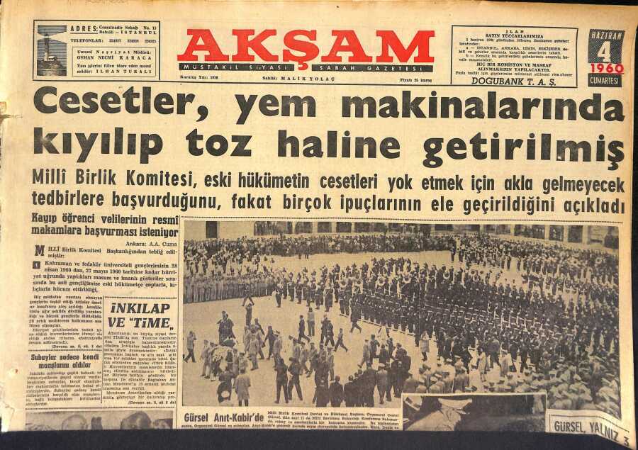 Akşam Gazetesi 4 Haziran 1960 - Cesetler , Yem Makinalarında Kıyılıp Toz Haline Getirilmiş - Dr. Küçük Dün Ankaraya Geldi GZ125298