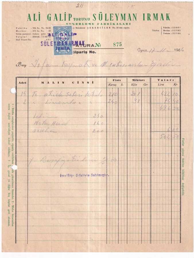 ALİ GALİP TORUNU SÜLEYMAN IRMAK ŞEKERLEME FABRİKASI İZMİR.1954 FATURA