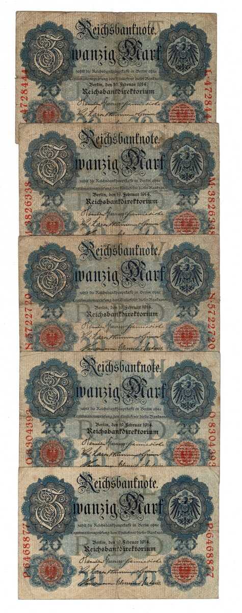 Almanya 20 Reichsmark 7 Şubat 1908 *SERİ L/M/N/O/P* Set ÇT YKP8379