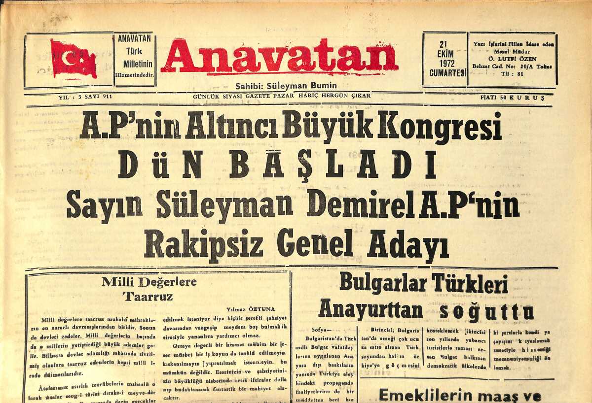 Anavatan Gazetesi 21 Ekim 1972 - Bulgarlar Türkleri Anayurttan Soğuttu - Pravda Kıbrıs Hakkında Makale Yayınlandı GZ158905