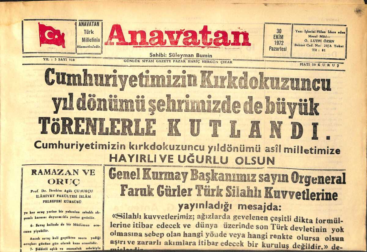 Anavatan Gazetesi 30 Ekim 1972 - Cumhuriyetimizin 49. Yıldönümü Şehrimizde de Büyük Törenlerle Kutlandı GZ158912