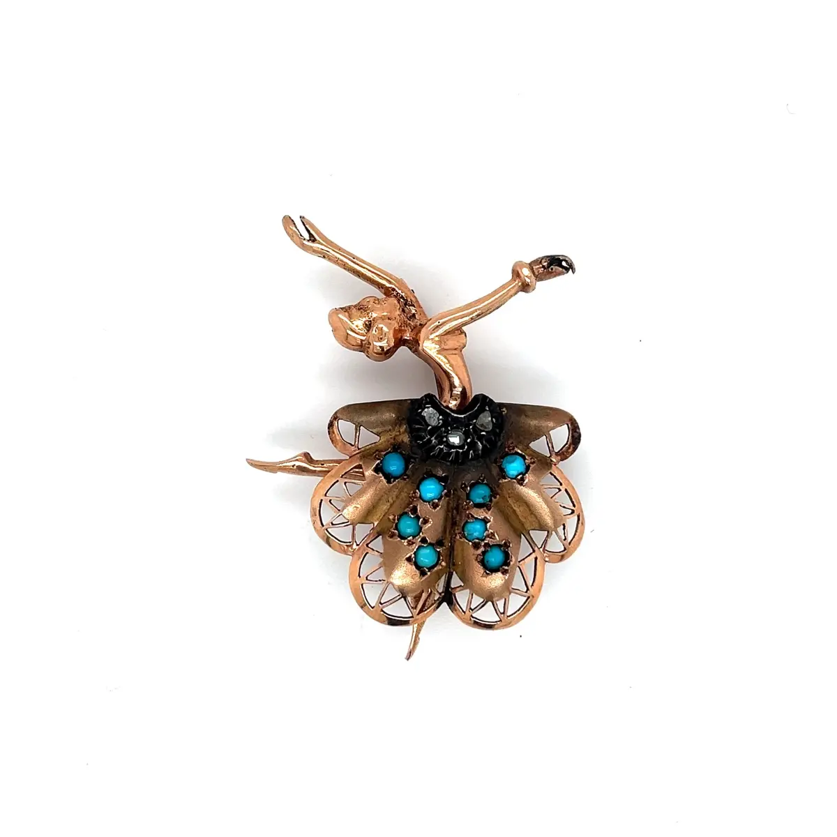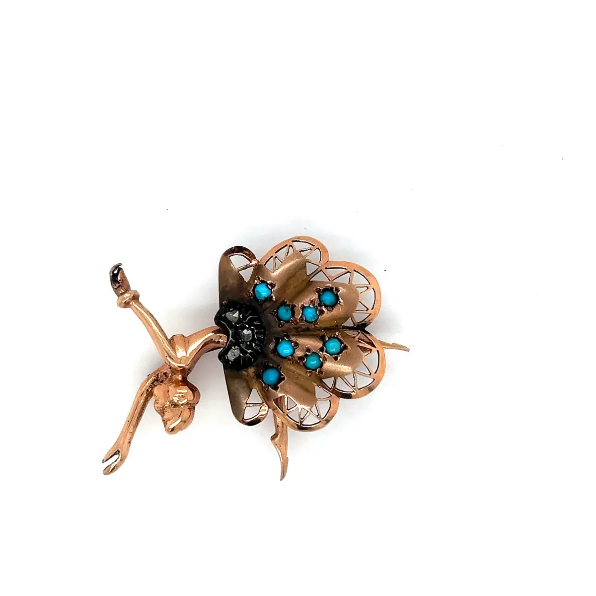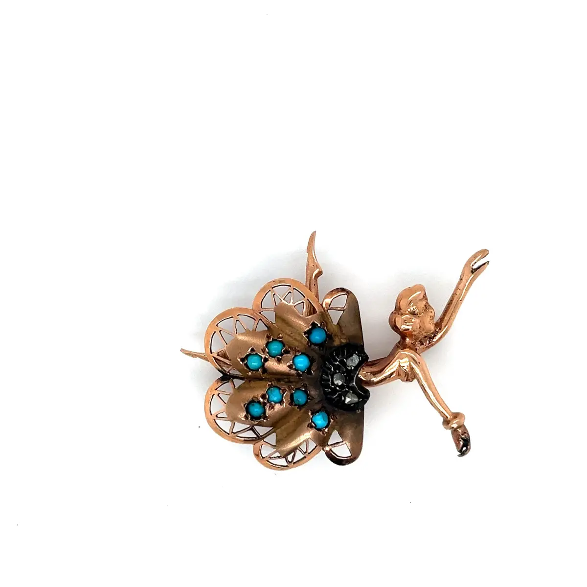 Gelince Haber VerAntika dönem, zarif figürlü tasarıma sahip firuze ve elmas taşlı broş. Peri figürünü andıran estetik formu ve ince işçiliği ile dikkat çeken bu özel parça, klasik antika mücevher sanatını yansıtmaktadır.