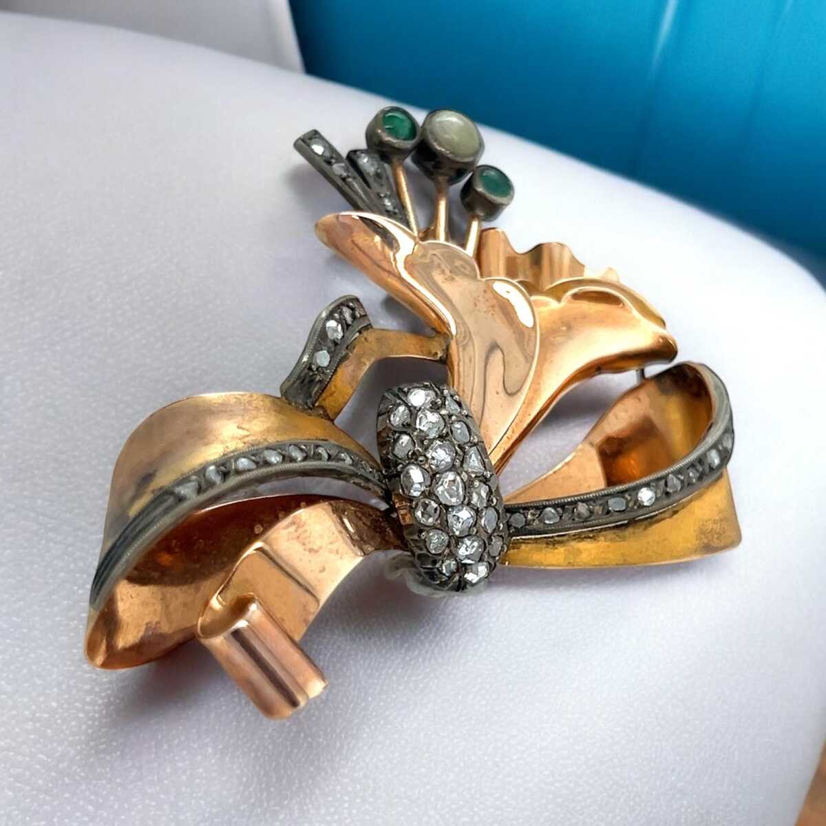 Antika 14 Ayar Elmas ve Zümrüt Taşlı Broş ELM082