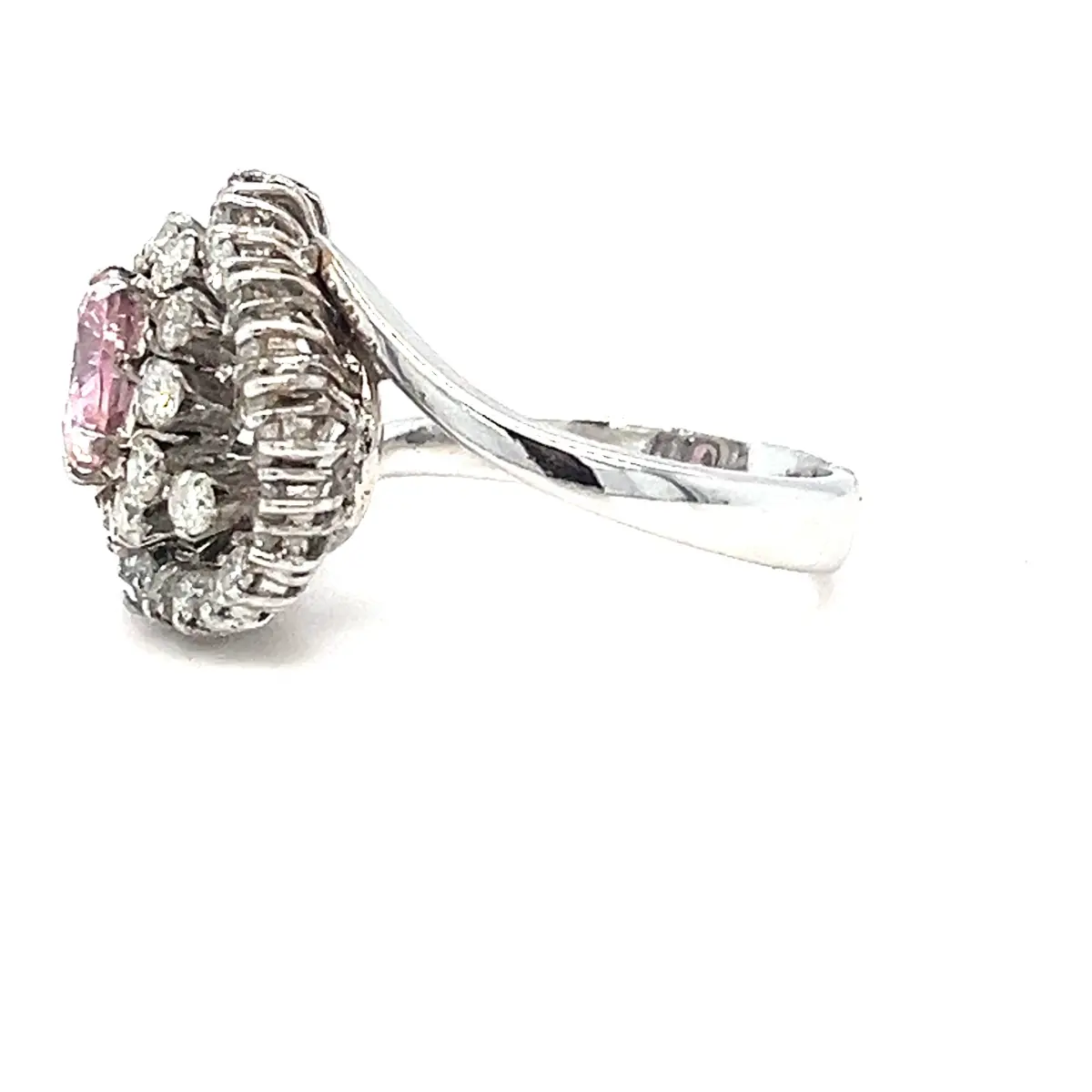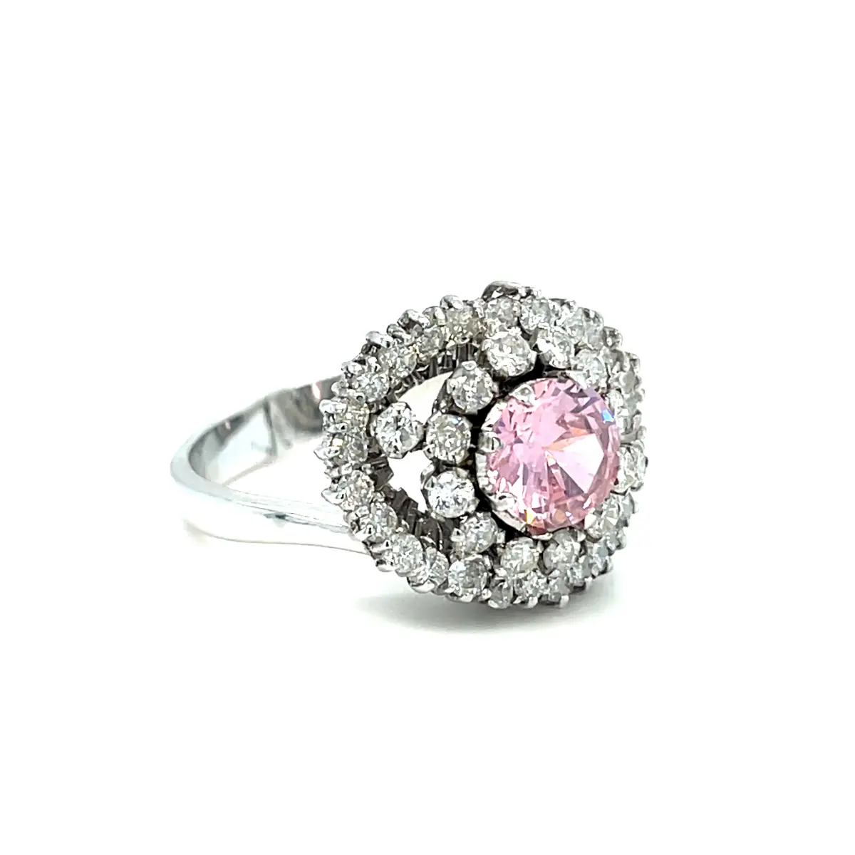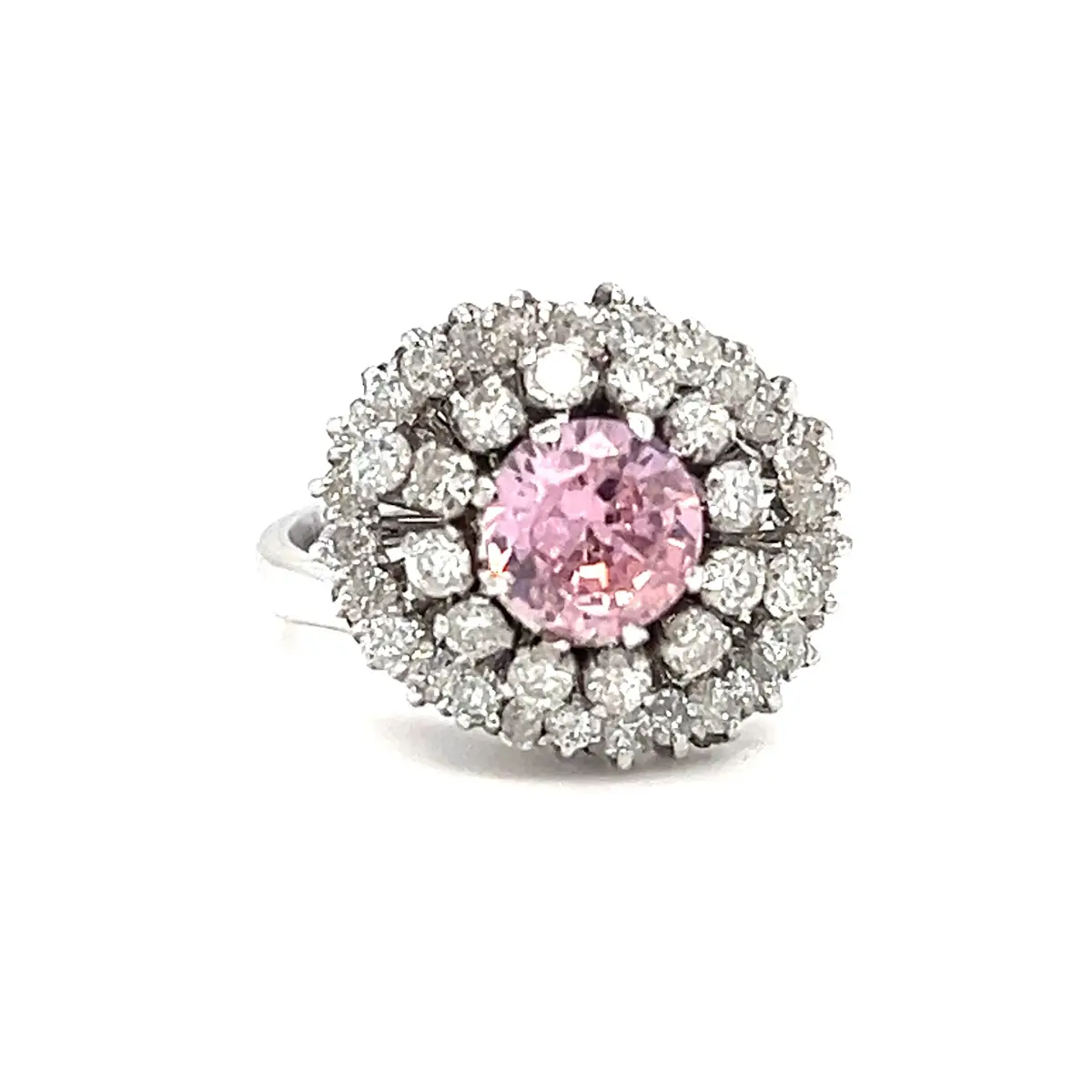 Yüzüğün merkezinde dikkat çekici pembe renkli taş bulunmakta olup çevresi doğal elmas taşlarla çevrilmiştir. Klasik halo formunda tasarlanmış bu özel parça, hem koleksiyonluk hem de şık bir mücevherdir.