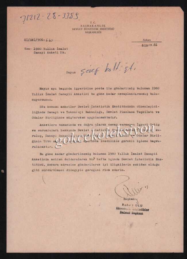 Başbakanlık Devlet İstatistik Enstitüsü Evrağı EFM315