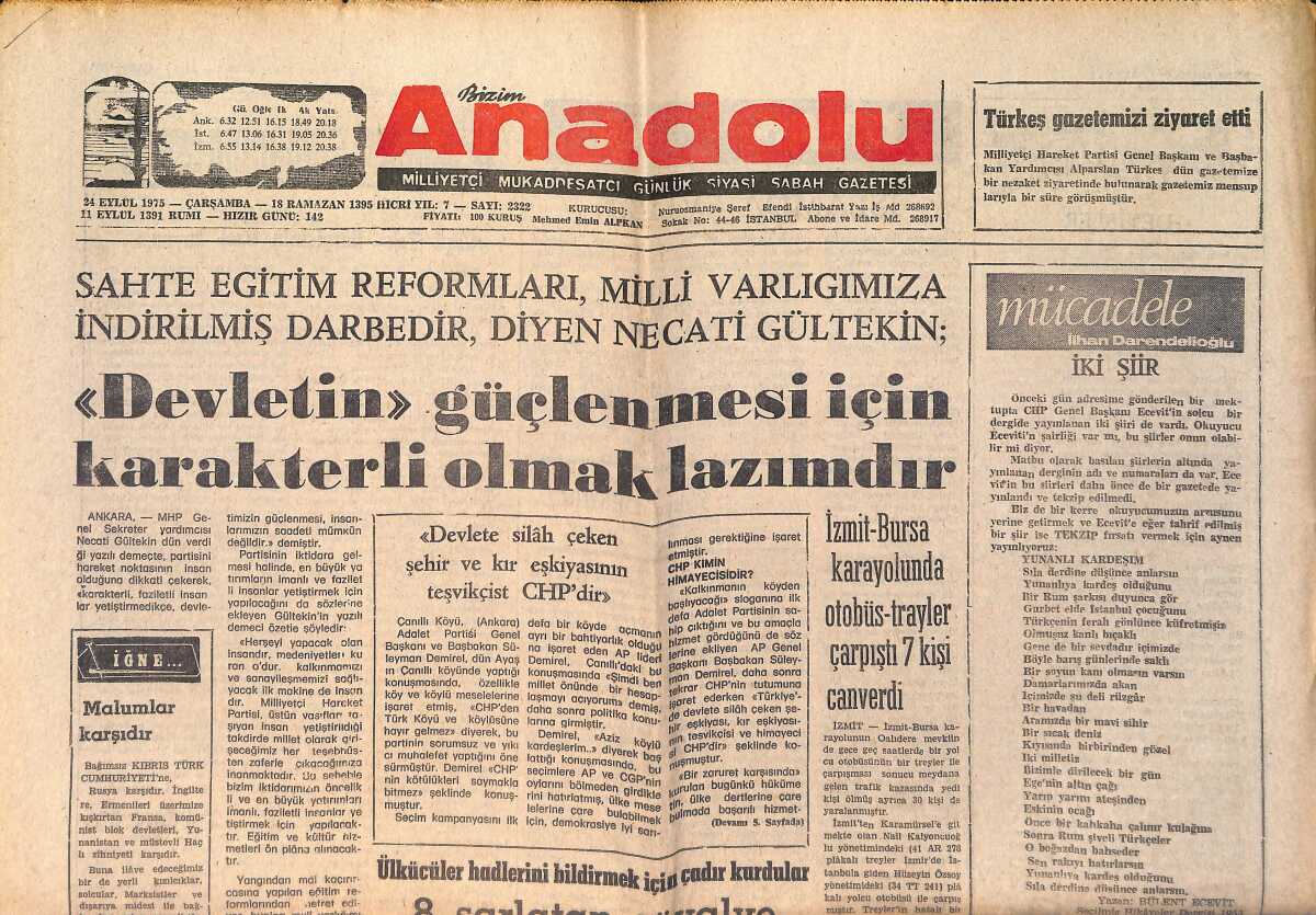 Bizim Anadolu Gazetesi 24 Eylül 1975 - OPEC Ülkeleri Petrole Yüzde On Zam Yapacaklar - Başkan Ford'a Suikast Yapıldı GZ158728