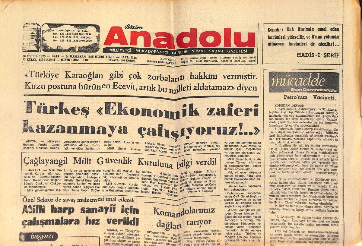 Bizim Anadolu Gazetesi 30 Eylül 1975 - İspanya'daki İdamların Tepkileri Devam Ediyor - Ecevit Milleti Kışkırtıyor GZ158731
