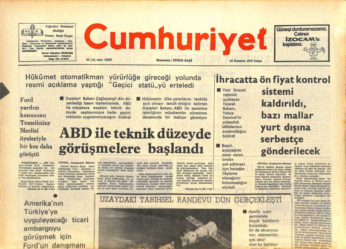 Cumhuriyet Gazetesi 18 Temmuz 1975 - ABD İle Teknik Düzeyde Görüşmelere Başlandı - Uzay Araçları Apollo İle Soyuz Almanya Üzerinde Buluştular GZ143687