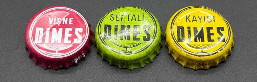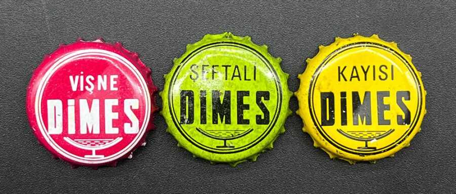 Dimes Meyve Suları – Vişne / Şeftali / Kayısı Eski Gazoz Kapakları (Nadir Tip, 3’lü Lot) AOB3032