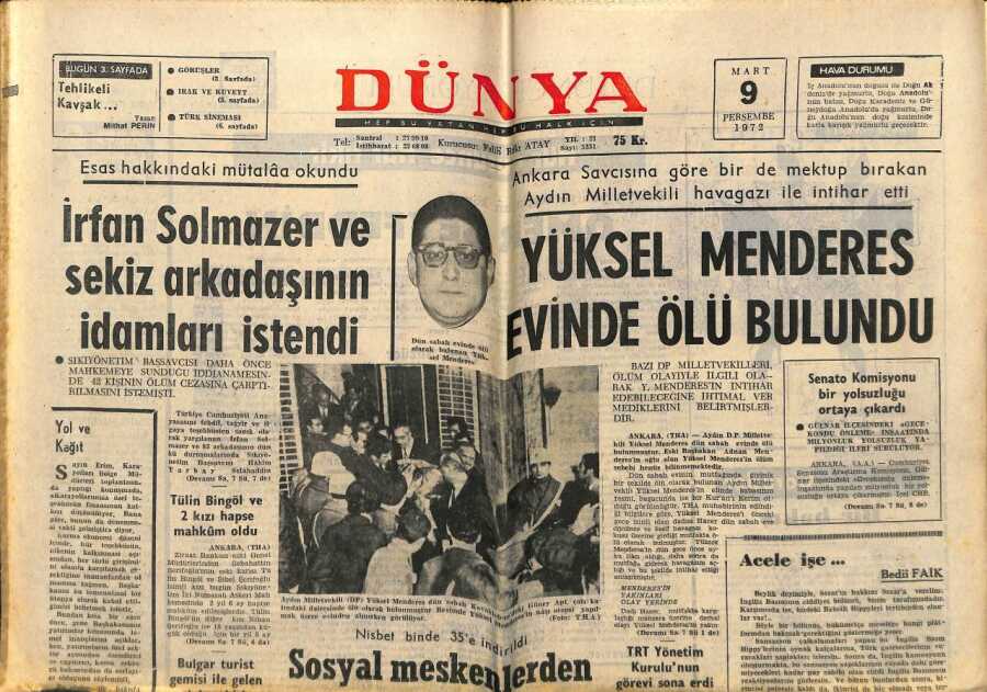 Dünya Gazetesi 9 Mart 1972 - Yüksel Menderes Evinde Ölü Bulundu GZ61168