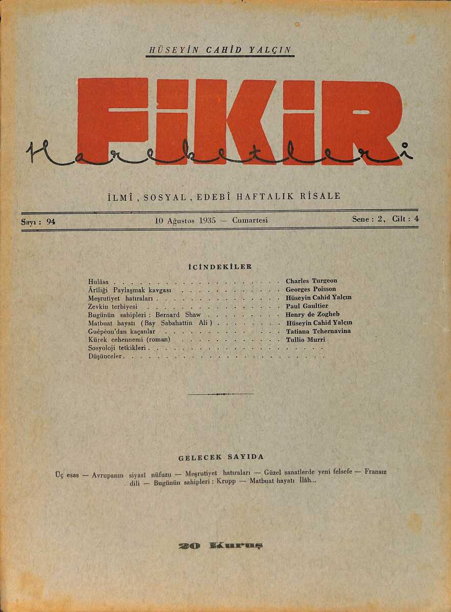 Fikir Hareketleri İlmi, İçtimai, Edebi Haftalık Risale 10 Ağustos 1935 Sayı: 94 - Hüseyin Cahit Yalçın - Charles Turgeon NDR98781