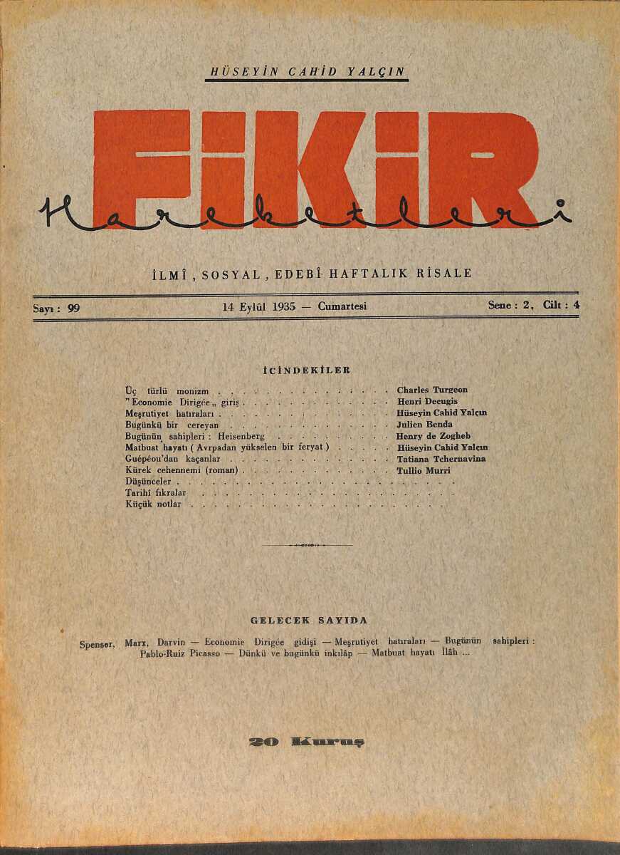 Fikir Hareketleri İlmi, İçtimai, Edebi Haftalık Risale 14 Eylül 1935 Sayı: 99 - Hüseyin Cahit Yalçın - Charles Turgeon NDR98786